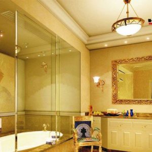 • Màu vàng kim cổ điển cùng hoa văn tinh tế, mang hơi hướng châu Âu, vừa làm ấm, vừa trang trí cho phòng tắm.